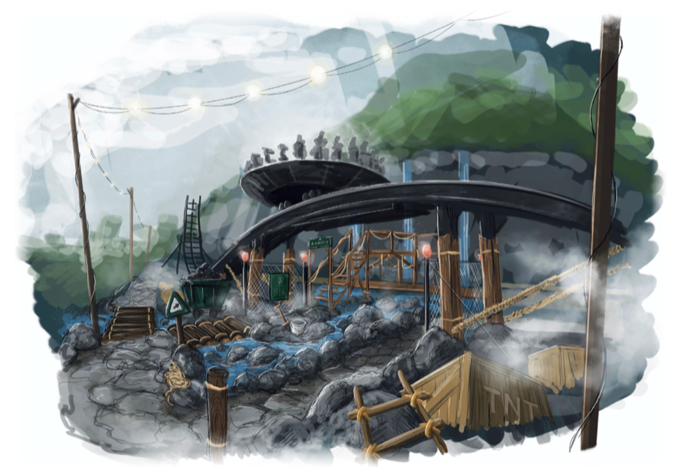 Et stort ras har gått i gruvene i fjellet. Steinene er ustabile, og du som gjest er på besøk midt i gruven når Raset går. Her havner du oppå en av steinene som har falt ned på gruveskinnene.